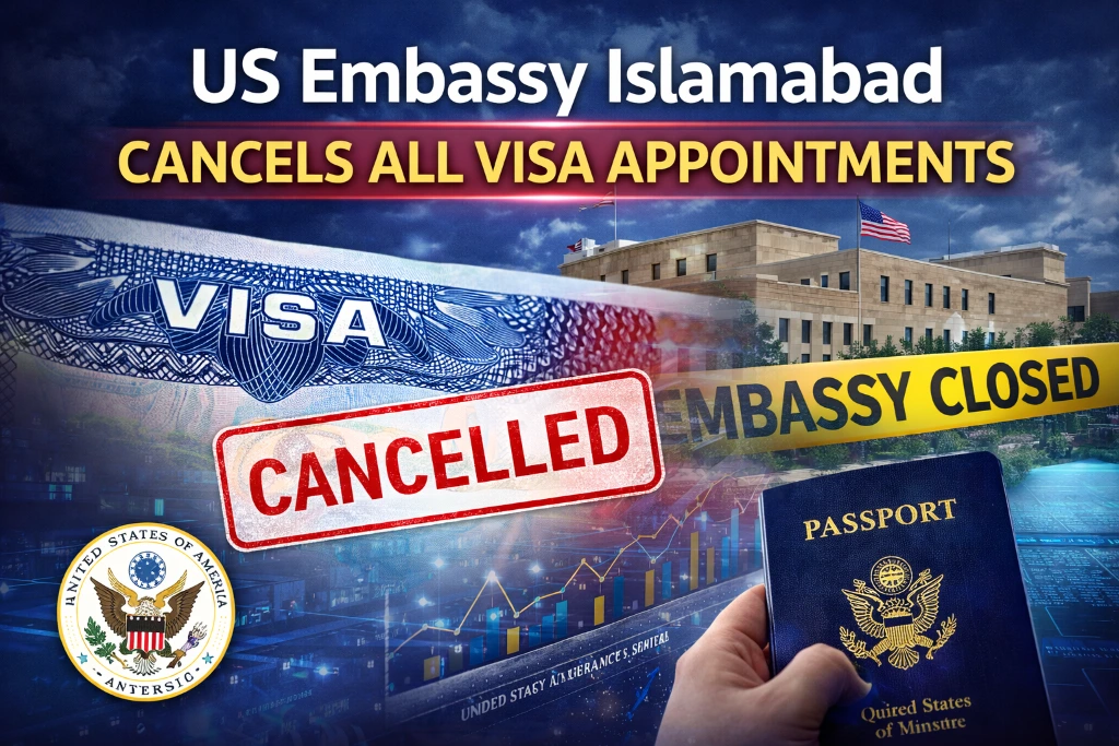 مسافروں اور تارکینِ وطن کے لیے ایک اہم اپ ڈیٹ میں اسلام آباد میں امریکی سفارت خانے نے آئندہ ہفتے کے لیے شیڈول تمام ویزا اپائنٹمنٹس منسوخ کرنے کا باضابطہ اعلان کیا ہے۔ اس منسوخی کا اطلاق امیگرینٹ (immigrant) اور نان امیگرینٹ (nonimmigrant) دونوں ویزا کیٹیگریز پر ہوگا۔