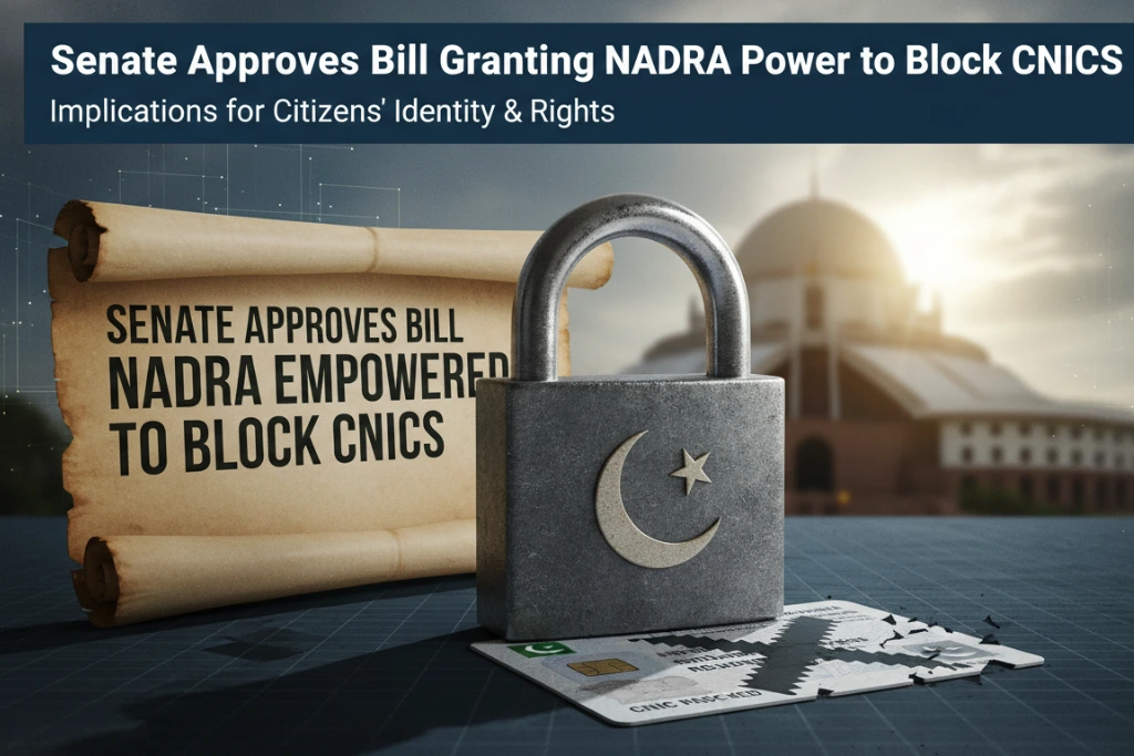 سینیٹ کی ایک کمیٹی نے باضابطہ طور پر ایک حکومتی بل کی منظوری دے دی ہے جو نیشنل ڈیٹا بیس اینڈ رجسٹریشن اتھارٹی (نادرا) کو کمپیوٹرائزڈ قومی شناختی کارڈز (CNICs) کو دو ماہ تک عارضی طور پر ضبط یا بلاک کرنے کا اختیار دے گا۔ اس نئی ہدایت میں خاص طور پر مشتبہ غیر قانونی تارکین وطن کے زیر استعمال کارڈز کو بلاک کرنے کی اہلیت بھی شامل ہے۔