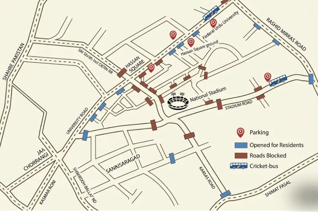 کرکٹ کے شائقین اور ٹیموں کی نقل و حرکت کے بھاری رش کو سنبھالنے کے لیے ٹریفک مینجمنٹ کے حکام نے ایک خصوصی ٹریفک پلان مرتب کیا ہے جس کا مقصد شہریوں کو روزمرہ کے سفر کی زحمت سے بچنے میں مدد فراہم کرنا ہے۔ یہ پلان میچ کے دنوں میں ٹریفک کی ہموار روانی کو یقینی بناتا ہے جس میں خاص طور پر نیشنل اسٹیڈیم کے ارد گرد کی بڑی شاہراہوں اور ٹیموں کے سفر سے منسلک مخصوص راستوں پر توجہ مرکوز کی گئی ہے۔ مسافروں کو مشورہ دیا جاتا ہے کہ وہ متبادل راستے تلاش کرنے اور شام کے رش کے اوقات میں ٹریفک جام سے بچنے کے لیے ٹریفک ایڈوائزری سے باخبر رہیں خاص طور پر اس وقت جب میچ شروع ہونے والے ہوں۔
