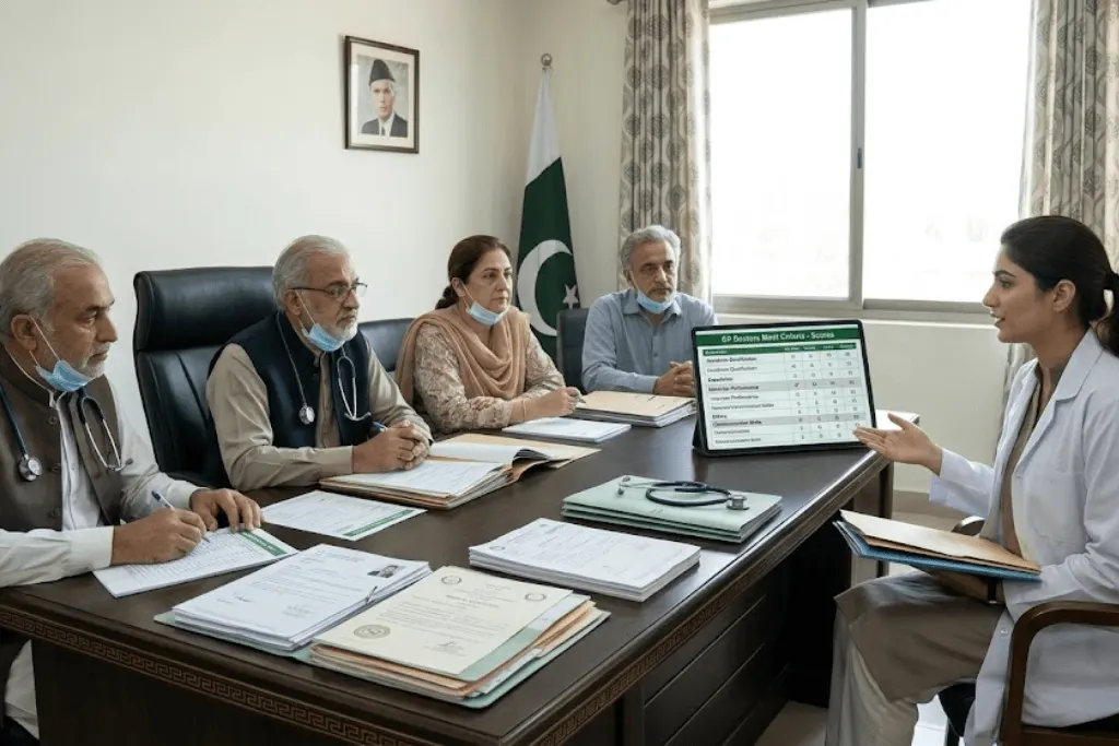 آخری 20 فیصد نمبر انٹرویو کے لیے رکھے گئے ہیں۔ طب کے شعبے میں فنی علم صرف آدھی جنگ ہے مریض سے بات چیت کرنے کی صلاحیت، ہمدردی کا مظاہرہ اور شدید دباؤ کے حالات کو سنبھالنا بھی اتنا ہی اہم ہے۔ انٹرویو پینل کو اب یہ مینڈیٹ دیا گیا ہے کہ وہ امیدوار کی ان سافٹ اسکلز کا جائزہ لے تاکہ یہ یقینی بنایا جا سکے کہ بھرتی ہونے والے ڈاکٹرز نہ صرف کاغذ پر ذہین ہوں بلکہ عملی طور پر مریضوں کے لیے مسیحا ثابت ہوں۔